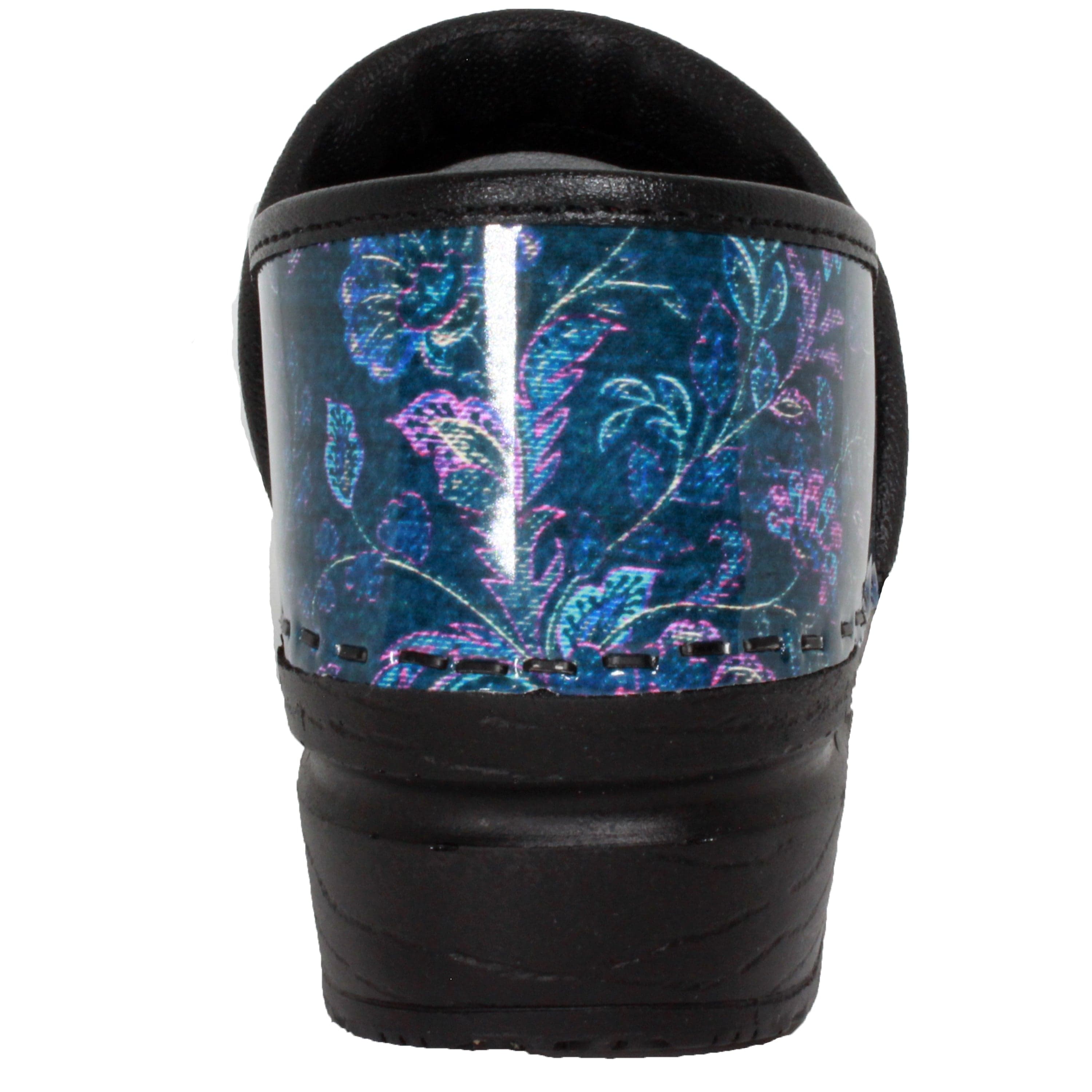 BJORK Professional Atalie leather clogs. Easy cleanable printed leather. Featuring a beautiful graphic of delicate flowers on denim. Color hues are blue with pink detail. The Professional clog is based on the classic yet functional Swedish clog silhouette, hand-made in Europe. It delivers all day comfort, thanks to its softer insole and arch support design.