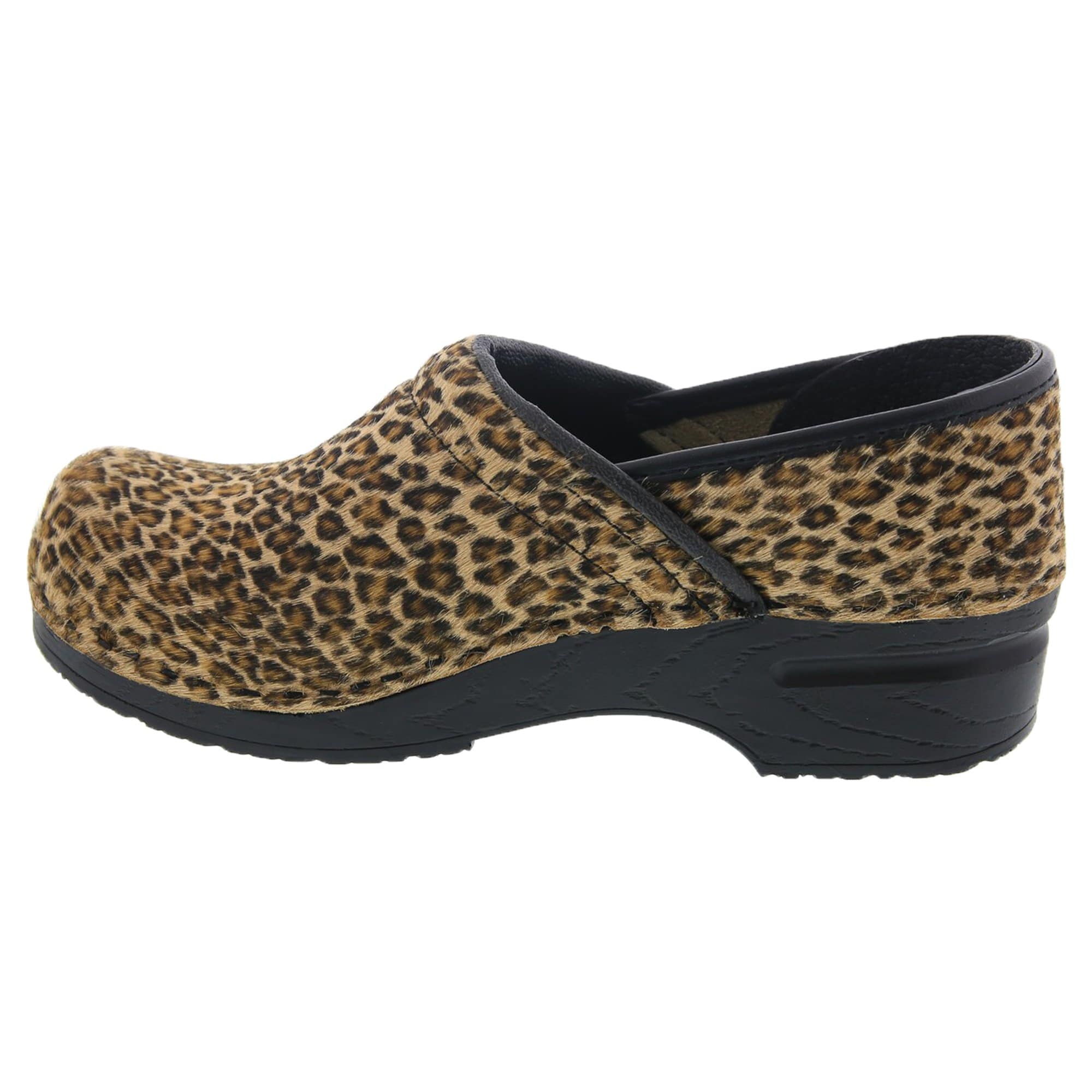 BJORK Professional in genuine leather and fur in Leopard print, from the Safari Collection. It is made from genuine cow leather and fur that has been dyed in a fun animal print pattern. The Professional clog is based on the classic yet functional Swedish clog silhouette, hand-made in Europe. It delivers all day comfort, thanks to it's softer insole and arch support design.