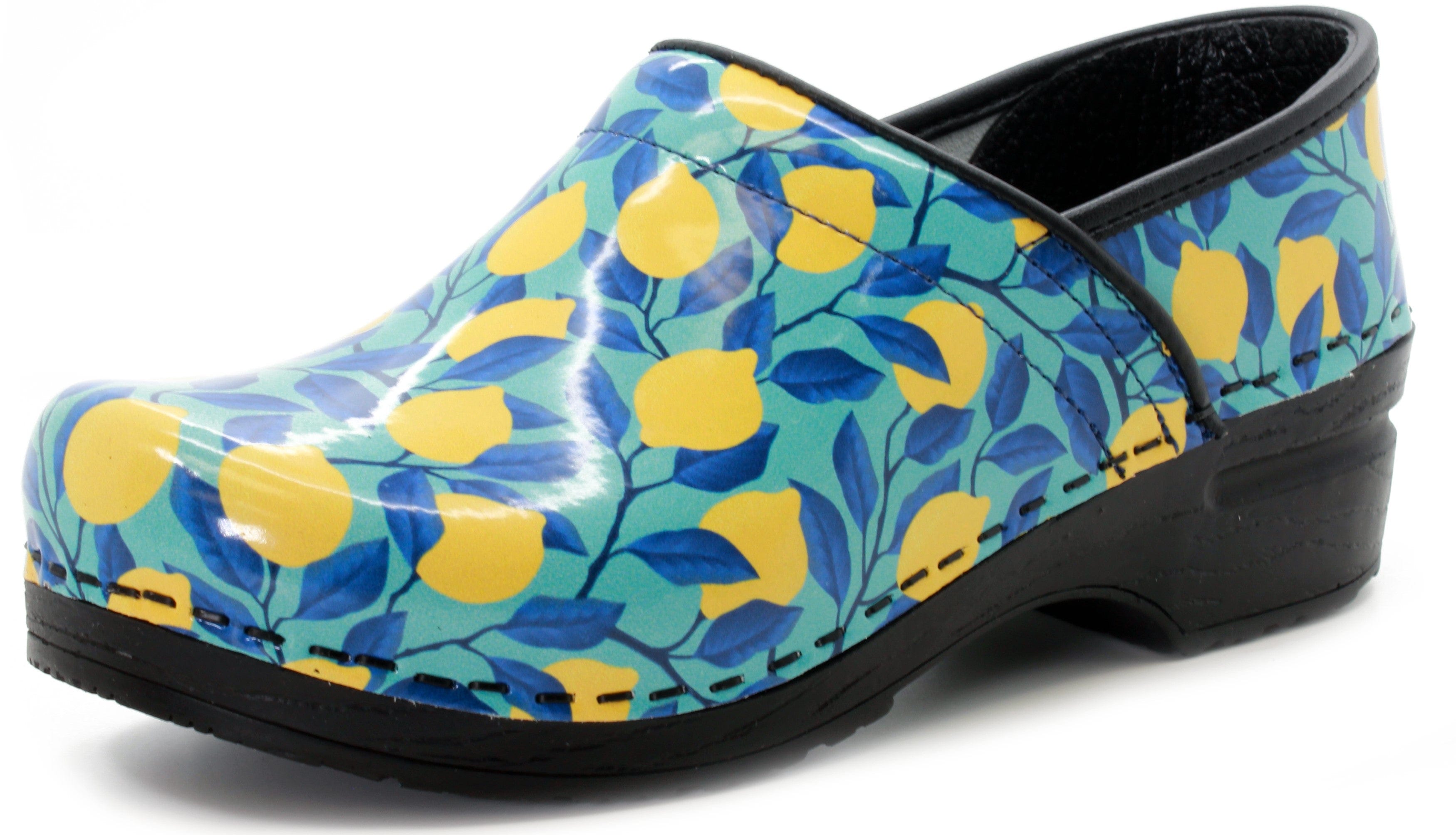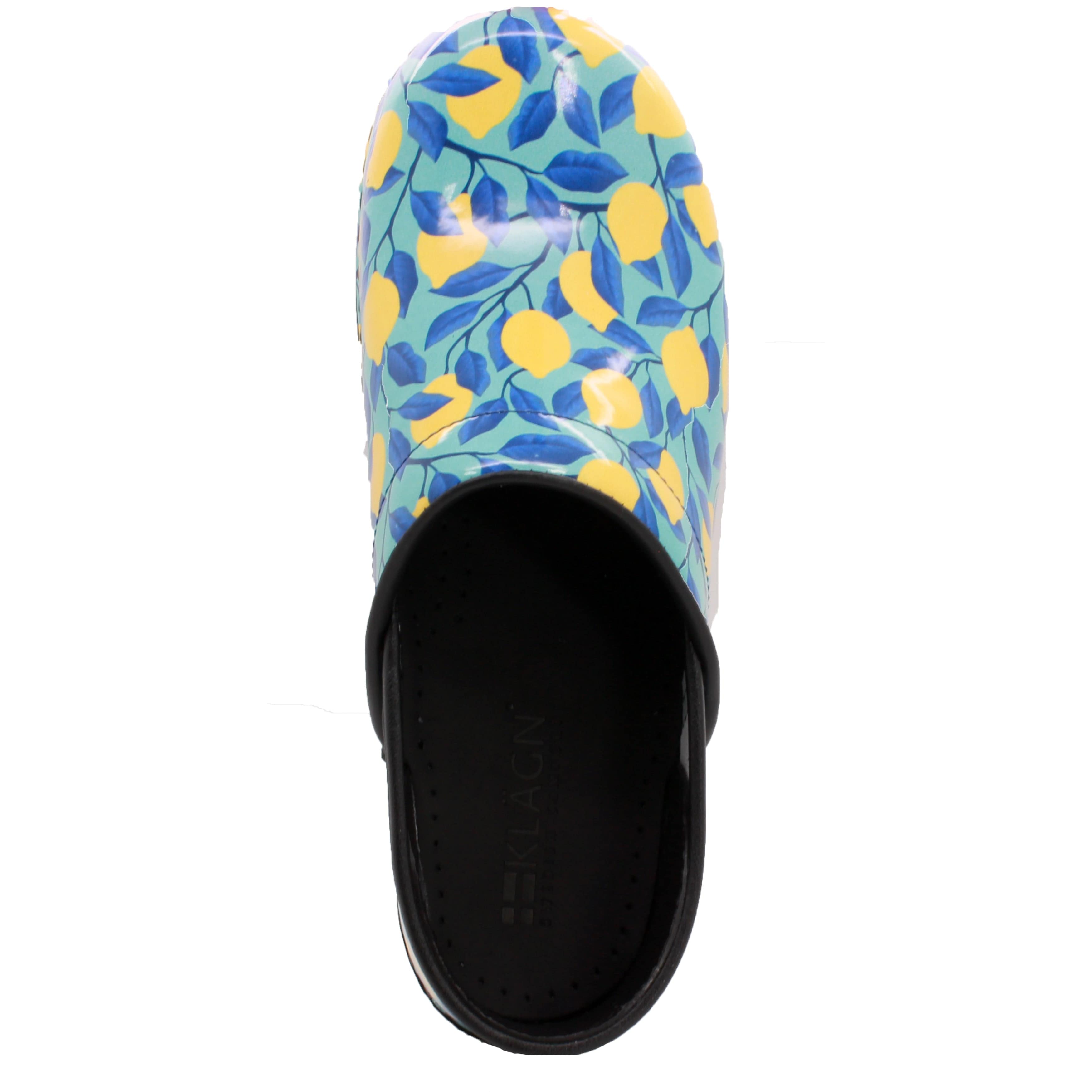 BJORK Professional Citron leather clogs. Easily cleanable printed leather. Featuring a beautiful graphic of yellow lemons on a tree with blue leaves against an aquamarine background. The Professional clog is based on the classic yet functional Swedish clog silhouette. Hand-made in Europe by KLÄGN®, the manufacturer of BJORK Swedish Comfort™. It delivers all day comfort, thanks to its softer insole and arch support design.
