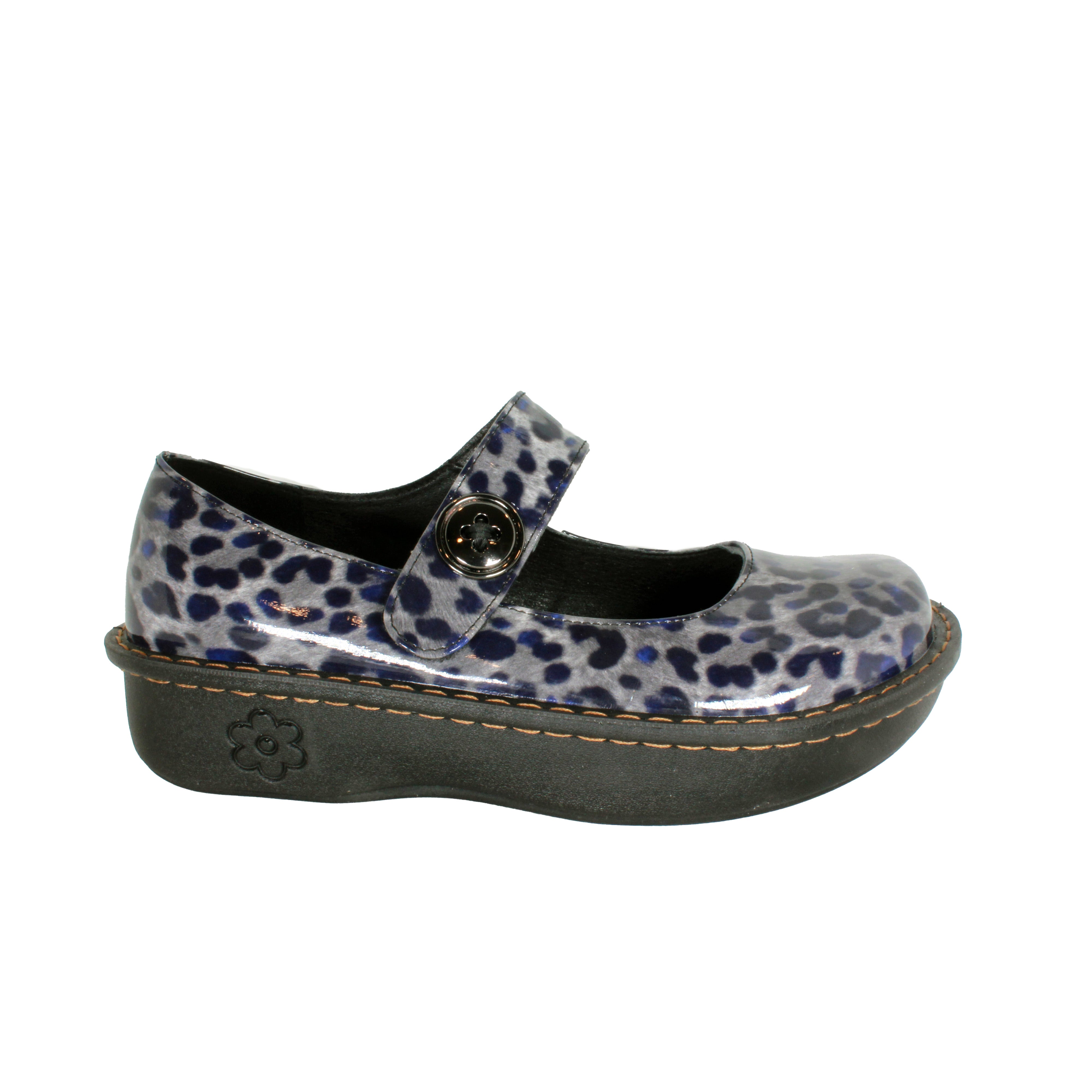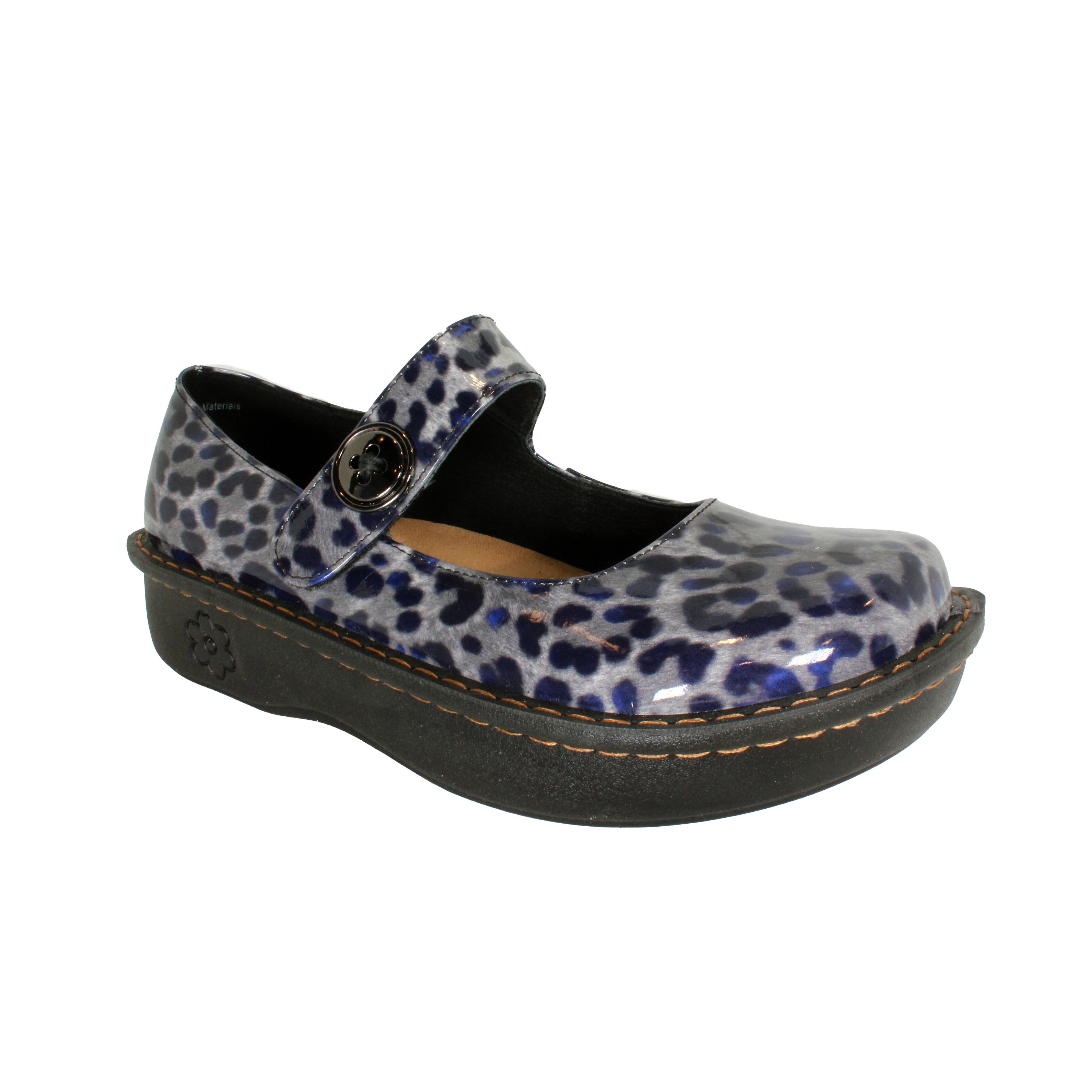 Step into stylish comfort with Sanosan Julia Comfort Mary-Jane Clogs. The adjustable Velcro strap, arch support, and removable ergonomic footbed provide ultimate comfort. The slip-resistant rubber outsole ensures safety while the Black Leopard patent adds a touch of elegance. The print has dark grey, black and under different light conditions, a hint of navy.