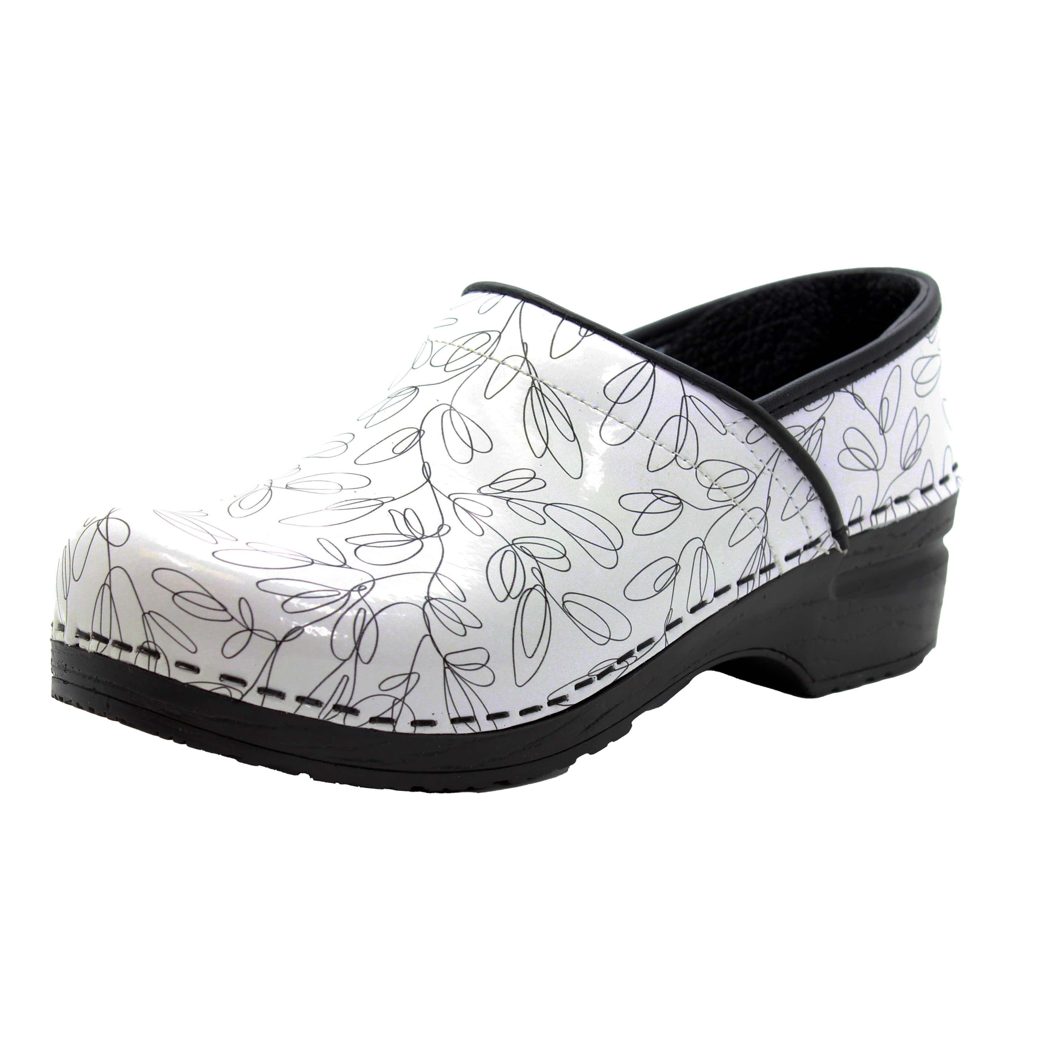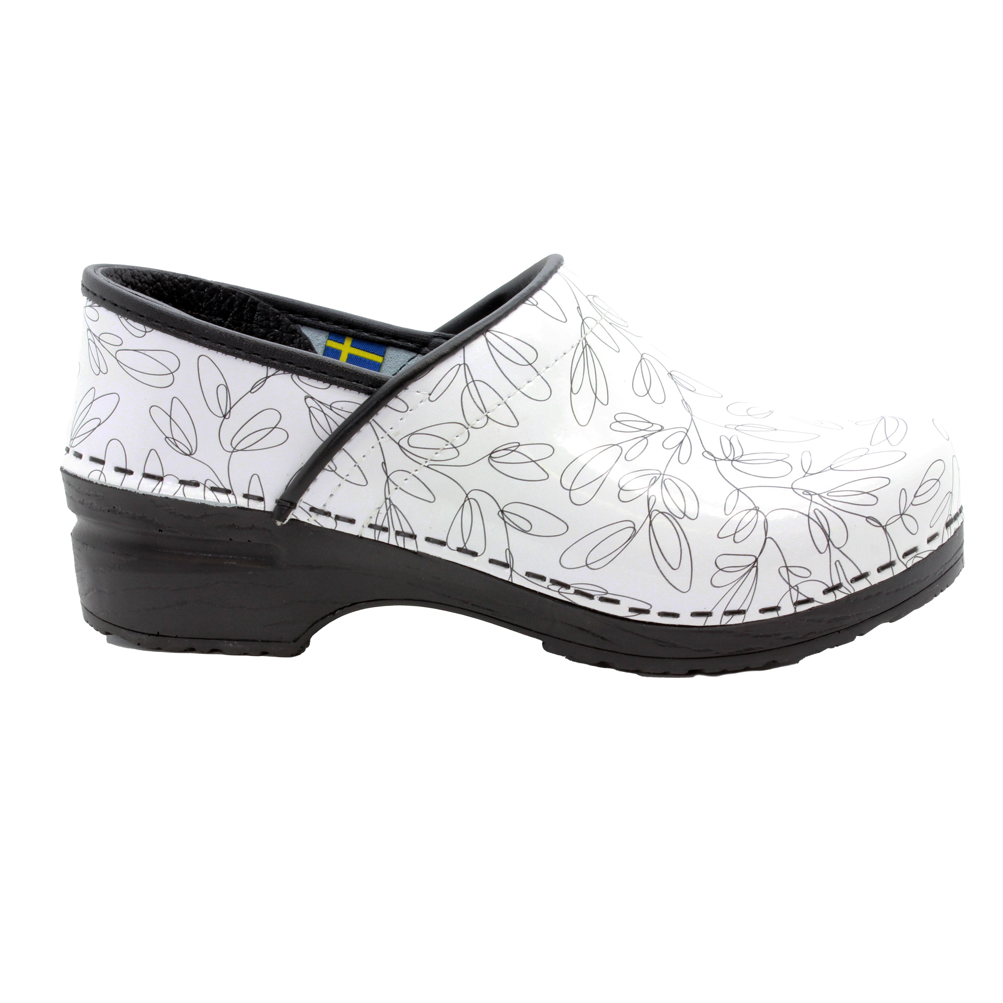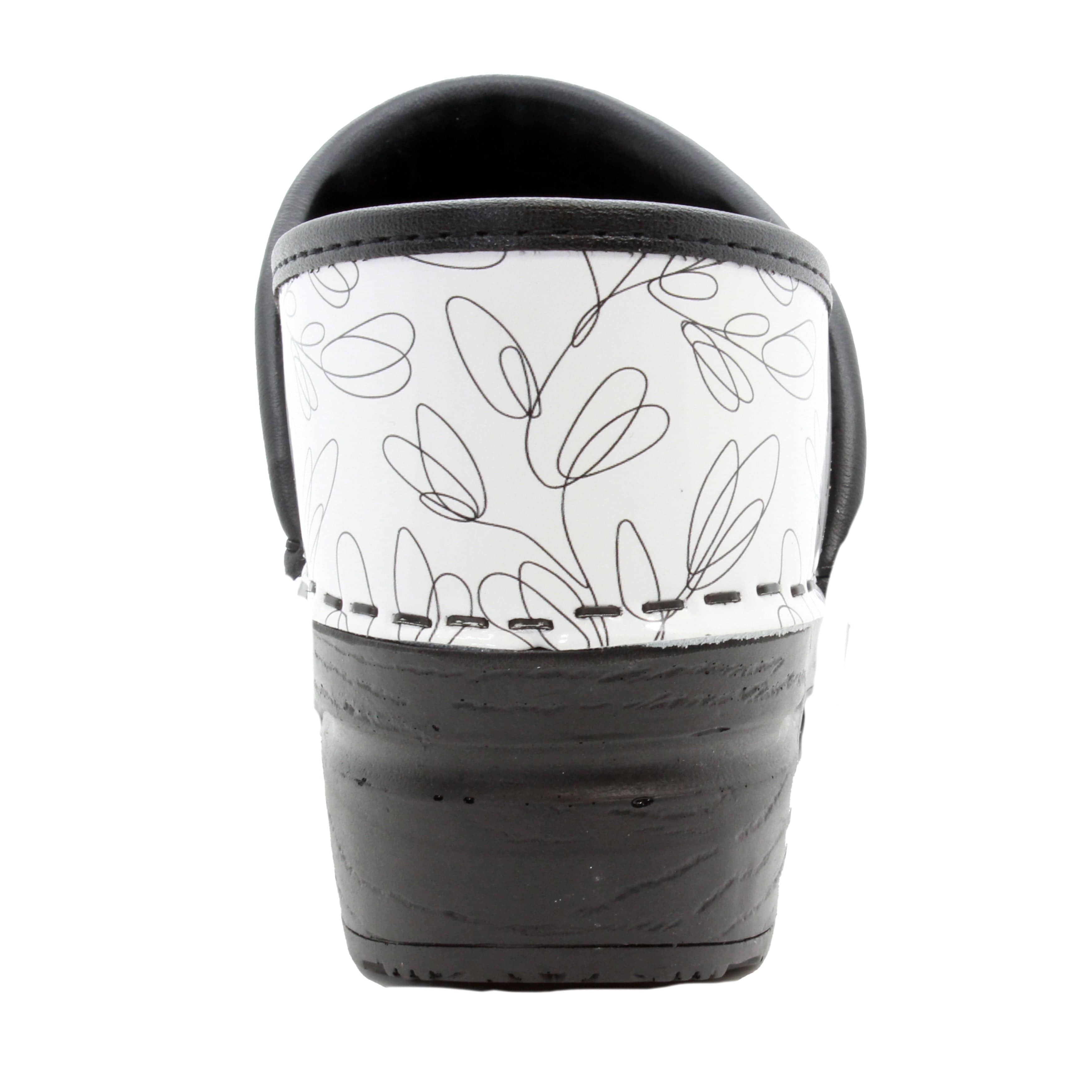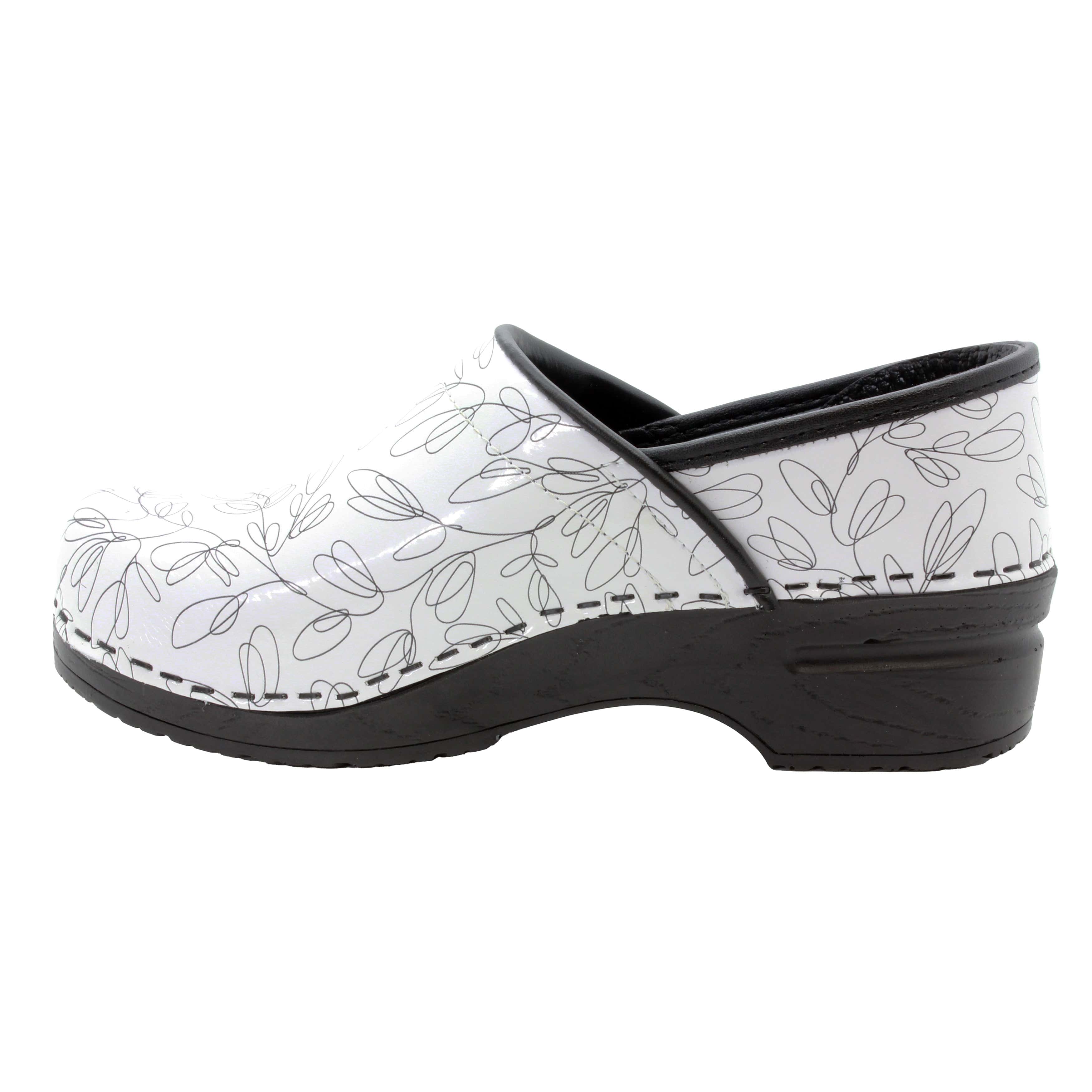 BJORK Professional Stencil leather clogs. Easy cleanable printed leather. The Professional clog is based on the classic yet functional Swedish clog silhouette, hand-made in Europe. It delivers all day comfort, thanks to its softer insole and arch support design. Original BJORK by KLÃGN.